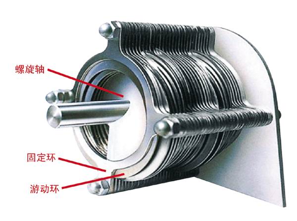 叠螺污泥脱水机的主体是由多重固定环和游动环构成,螺旋轴贯穿其中形成的过滤装置。前段为浓缩部,后段为脱水部,将污泥的浓缩和压榨脱水工作在一筒内完成,以独特微妙的滤体模式取代了传统的滤布和离心的过滤方式。